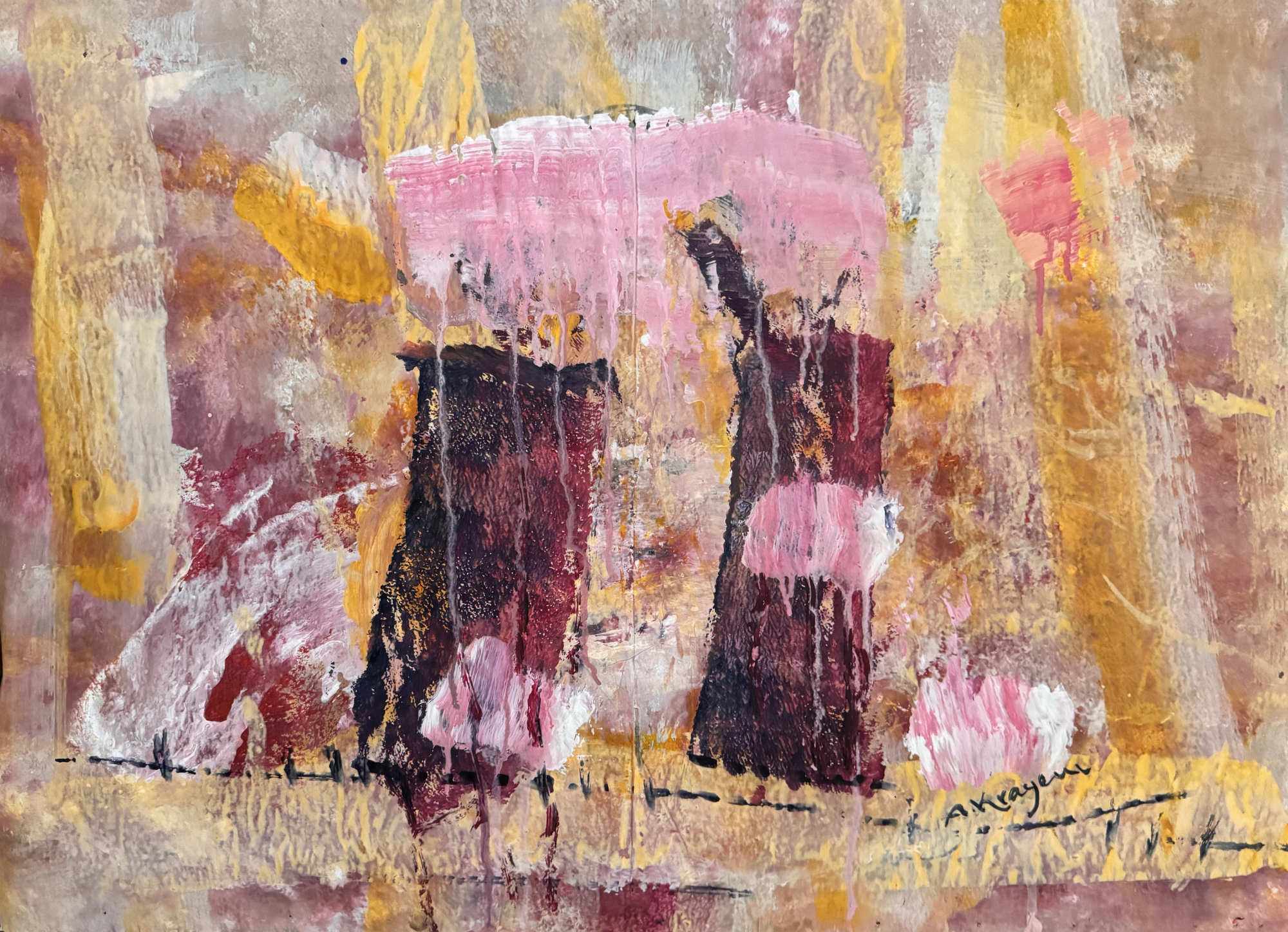 Schichtmalerei auf Zeitungspapier der Neuen Zürcher Zeitung – vielfach überschichtet bis zur Unkenntlichkeit. In dieser Serie setzt sich Krayem mit Wahrheitsgehalt, Deutung und Überformung von Nachrichten auseinander. Begriffe wie error, delete oder recover verweisen auf Löschen, Verändern und Neuschreiben von Information.